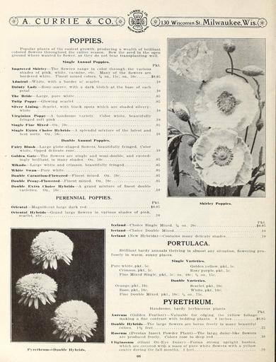 | Keywords: Garden and farm seeds (16372754915).jpg A CURRIE COl <br> 130 Wisconsin St Mil waukee Wis l <br> POPPIES <br> Popular plants of the easiest growth producing a wealth of brilliant <br> colored flowers throughout the entire season Sow the seed in the open <br> ground where wanted to flower as they do not bear transplanting well <br> Single Annual Poppies <br> Pkt <br> Improved Shirley The flowers range in color through the various <br> shades of pink white carmine etc Many of the flowers are <br> bordered white Finest mixed colors oz 15c; oz 50c 0 05 <br> Admiral White with a border of scarlet 10 <br> Dainty Lady Rosy-mauve with a dark blotch at the base of each <br> petal 10 <br> The Bride Large pure white 05 <br> Tulip Poppy Glowing scarlet 05 <br> Silver Lining Scarlet with black spots which are shaded silvery- <br> white 10 <br> Virginian Poppy A handsome variety Color white beautifully <br> fringed soft pink 10 <br> Single Fine Mixed Oz 20c <br> -A splendid mixture of the latest and <br> Single F vlra Choice Hybrid <br> best sorts Oz 50c <br> 05 <br> 10 <br> Double Annual Poppies <br> Fairy Blush Large globe-shaped flowers beautifully fringed Color <br> white tipped delicate rose 10 <br> Golden Gate The flowers are single and semi-double and exceed- <br> ingly brilliant in many shades Oz 50c 05 <br> Mikado Large white and crimson beautifully fringed 05 <br> White Swan Pure white 05 <br> Double Carnation-Flowered Finest mixed Oz 20c 05 <br> Double Peony-Flowered Finest mixed Oz 20c 05 <br> -A grand mixture of finest double <br> Double Extra Choice Hybrids- <br> varieties Oz 50c <br> 10 <br> PERENNIAL POPPIES <br> Pkt <br> Oriental Magnificent large dark red 0 05 <br> Oriental Hybrids Grand large flowers in various shades of pink <br> scarlet etc 10 <br> Shirley Poppies <br> Pkt <br> 0 05 <br> 10 <br> 10 <br> Iceland Choice Single Mixed oz 20c <br> Iceland Choice Double Mixed <br> Iceland New Hybrids Contains many delicate shades <br> PORTULACA <br> Brilliant hardy annuals thriving in almost any situation flowering pro- <br> fusely in warm sunny places <br> Single Varieties <br> Pure white pkt 5c Golden yellow pkt 5c <br> Crimson pkt 5c Rosy purple pkt 5c <br> Fine Mixed Single pkt 5c; oz 40c; oz 15c <br> Double Varieties <br> Orange pkt 10c Scarlet pkt 10c <br> Rose pkt 10c White pkt 10c <br> Fine Double Mixed pkt 10c; Vs oz 75c <br> PYRETHRUM <br> t'f yr I li in in Double Hybrids <br> Handsome hardy herbaceous plants <br> Pkt <br> Ann- ii in Golden Feather Valuable for edging' the yellow foliage <br> making a fine contrast with bedding plants 6 inches 0 05 <br> Double Hybrids The large flowers are borne freely in many beautiful <br> colors 1 y 2 feet 25 <br> Boscum Persian Insect Powder Plant The large daisy-like flowers <br> are produced freely Colors rose to deep red 10 <br> I ligiiioNiiiii Giant Ox-Eye Daisy Forms strong upright bushes <br> which are covered with a mass of pure white flowers with a yellow <br> center during the fall months \ t'et't 10 <br> 0ÂŤ 42156518 132761 65916 Page 66 Text http //www biodiversitylibrary org/page/42156518 1912 10 5962/bhl title 65916 A Currie Company ; Henry G Gilbert Nursery and Seed Trade Catalog Collection NameFound F vlra NameFound Pyrethrum NameConfirmed Pyrethrum Medik EOLID 2879753 NameBankID 8777274 Biodiversity Heritage Library Garden and farm seeds spring 1912 Garden Stories Bulbs Plants Catalogs Equipment and supplies Flowers Gardening Nurseries Horticulture Plants Ornamental Seeds Vegetables U S Department of Agriculture National Agricultural Library bhl page 42156518 dc identifier http //biodiversitylibrary org/page/42156518 bhlGardenStories BHLinbloom bulbs plants nurseries horticulture plants ornamental u s department of agriculture national agricultural library bhlgardenstories bhlinbloom Information field Flickr posted date ISOdate 2015-01-26 Check categories 2015 August 25 CC-BY-2 0 BioDivLibrary https //flickr com/photos/61021753 N02/16372754915 2015-08-25 06 52 06 cc-by-2 0 PD-old-70-1923 Garden and farm seeds 1912 Photos uploaded from Flickr by FĂŚ using a script |