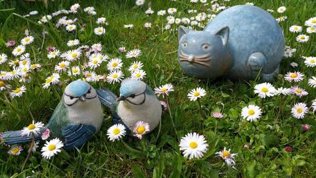 Keywords: garden meadow spring statuette decor out cat hunting birds flowers grass