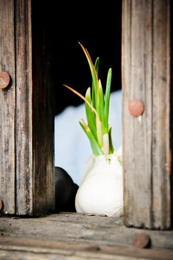 Keywords: garlic green window wood sprouting spring