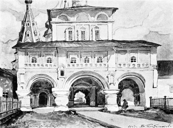 | Keywords: Gate of the Archangelsky monastery (Veliky Ustyug).jpeg ru Святые во ота А хангельского монасты я в Великом Устюге 1908 Ежегодник Общества а хитекто ов-художников 1908 В А Плотников Custom license marker 2014 07 10 PD-RusEmpire Uploaded with UploadWizard Mikhailo-Arkhangelsky Monastery Veliky Ustyug Vladimir Plotnikov |