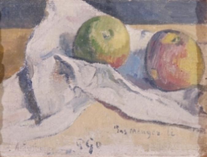 | Keywords: Gauguin 1895 Nature morte aux pommes.jpg Artwork Creator Paul Gauguin Nature morte aux pommes « Pas manger » Natura morta amb pomes No en mengeu Still Life With Apples 1895 oil on canvas cm 19 25 9 Institution Musée des Beaux-Arts Reims accession number object history exhibition history P Go signature lower center ~ Pas manger li caption lower right fr Not eat apples Probably a misshaped v which would refer to a series of native apples called vi Au bord de l'Océan avril 1894 en route pour Tahiti place verso fr On bord of the Océan April 1894 sic en route for Tahiti In fact he travelled in 1895 http //www linternaute com/musee/diaporama/1/7258/musee-des-beaux-arts-de-reims/5/33940/nature-morte-aux-pommes/ Linternaute Gauguin catalogues 533 356 PD-old-100-1923 Paintings by Paul Gauguin in France Paintings in the musée des Beaux-Arts de Reims 1890s paintings by Paul Gauguin Polynesia by Paul Gauguin Still life paintings by Paul Gauguin |