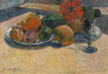 | Keywords: Gauguin Nature morte aux mangos et à la fleur d'hibiscus.jpg Artwork Creator Paul Gauguin Nature morte aux mangos et à la fleur d'hibiscus ou Fruits exotiques et fleurs rouges Natura morta amb mangos i flor d'hibisc o Fruites exòtiques i flors roges 1887 oil on canvas cm 33 46 private collection accession number object history credit line bottom left P Gauguin 87 Gauguin catalogues 238 256 56 http //www the-athenaeum org/art/detail php ID 2528 PD-old-100 1887 paintings Still life paintings by Paul Gauguin 1887 Paintings by Paul Gauguin in private collections 1887 1880s paintings by Paul Gauguin 1887 Images from the-athenaeum org 1880s still-life paintings |