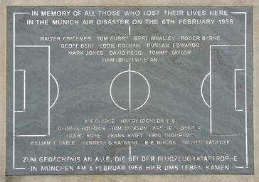 Keywords: Gedenkstein Machester United Platte.jpg en Top tablet at the memorial stone in remembrance of the Munich air disaster 06 Februrary 1958 de Tafel auf dem Gedenkstein zum Flugzeugabsturz am 06 Februar 1958 own Flo Sorg 2009-06-01 48 7 33 02 N 11 40 36 55 E type landmark_region DE_heading WNW Munich air disaster memorial Plaques in Munich