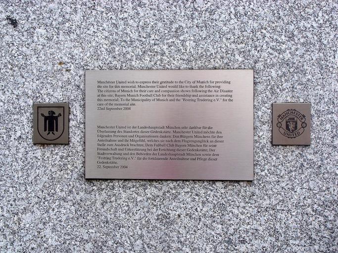 Keywords: Gedenkstein Manchester United Inschrift.jpg en Tablet bearing the inscription at the memorial stone in remembrance of the Munich air disaster 06 Februrary 1958 de Texttafel am Gedenkstein zum Flugzeugabsturz am 06 Februar 1958 own Flo Sorg 2009-06-01 48 7 33 02 N 11 40 36 55 E type landmark_region DE_heading WNW Munich air disaster memorial Plaques in Munich |
