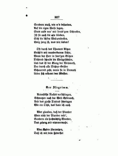 | Keywords: Gedichte Eichendorff (1864) 327.gif Gedichte_Eichendorff_ 1864 _ gif 328 Der Isegrimm aus Joseph Freiherrn von Eichendorff s sämmtliche Werke 2 Auflage S 327-328 books google com 1864 Joseph von Eichendorff 1788 1857 PD-old Joseph von Eichendorff De Wikisource book leaflet Poetry of Germany |