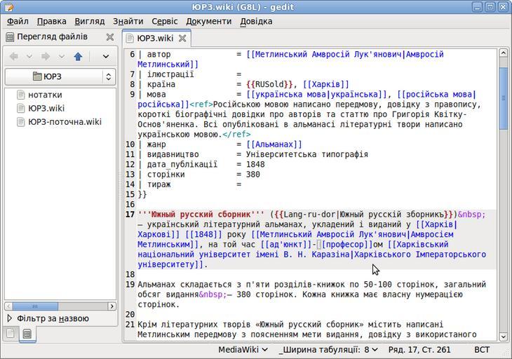 Keywords: Gedit 2.30.3 Ukrainian.png gedit gedit 2 30 en text editor in the GNOME en environment running under Ubuntu operating system Ubuntu en with a Ukrainian language Ukrainian en version of the user interface en Displayed in the editor is an excerpt from Южный усский сбо ник uk article in Ukrainian Wikipedia en w Текстовий едакто uk gedit gedit 2 30 uk в Ubuntu uk з Ук аїнська мова ук аїнською uk ве сією Інте фейс ко истувача інте фейсу uk Текст в едакто і ф агмент статті Южный усский сбо ник uk в Ук аїнська Вікіпедія ук аїнській Вікіпедії uk Screenshot of free software Знімок ек ану вільного п ог амного забезпечення Screenshot made by ReAl Знімок ек ану з облений ReAl 2013-08-10 Software depicted is distributed under the terms of w GNU General Public License GNU GPL en Text depicted inside the editor window is Wikipedia article excerpt П ог амне забезпечення відбите на знімку ек ану поши юється на умовах w GNU General Public License GNU GPL uk Текст у вікні едакто а ф агмент статті у Вікіпедії free screenshot GPL Screenshots of gedit