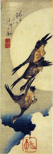 | Keywords: Geese flying past the full moon (5759417842).jpg en <b>Accession Number </b> 1957 363 <b>Display Artist </b> Utagawa Hiroshige <b>Display Title </b> Geese flying past the full moon <b>Series Title </b> Birds and Flowers <b>Creation Date </b> 1832-1835 <b>Medium </b> Woodblock <b>Height </b> 14 3/4 in <b>Width </b> 5 3/16 in <b>Display Dimensions </b> 14 3/4 in x 5 3/16 in 37 47 cm x 13 18 cm <b>Publisher </b> Kawaguchiya Shozo <b>Credit Line </b> Bequest of Mrs Cora Timken Burnett <b>Label Copy </b> Surrounded by a spacious sky the geese in this scene fly in formation The last goose bends its neck to the right suggesting that something there has caught its attention The nostalgic poem on the print reads Will it come againanother night like this one Wild geese and the moon Wild geese kari in flight across the face of the moon were among the most popular motifs during the 1830s when demand for natural history prints reached a peak The season depicted here is the eighth month the time when migrating geese return; the regularity of their migration made geese a suitable symbol of enduring reliability <b>Label Copy Spanish </b> Rodeados por el cielo extenso los gansos en esta escena vuelan en formacin El ltimo ganso dobla el cuello a la derecha sugiriendo que algo le ha llamado la atencin El poema nostlgico en la impresin lee Volver una noche como esta Gansos salvajes y la luna Los gansos salvajes kari volando frente a la faz de la luna era un motivo muy popular durante los 1830 cuando la demanda por los grabados de la historia natural alcanz su apogeo La estacin representada aqu es el octavo mes cuando regresan los gansos emigrantes; por la regularidad de su migracin los gansos eran un smbolo de la fiabilidad eterna <b>Collection </b> <a href http //www sdmart org/art/our-collection/asian-art rel nofollow >The San Diego Museum of Art</a> 2007-05-13 11 24 01 https //www flickr com/photos/thesandiegomuseumofartcollection/5759417842/ Flickr en thesandiegomuseumofartcollection PD-old-100 Files from the San Diego Museum of Art to be checked |