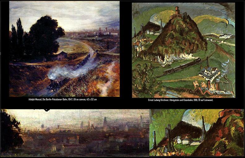 | Keywords: Gegenüberstellung Menzel-Kirchner - Motiv Zug.JPG Gegenüberstellung der Gemälde von Adolph Menzel Berlin-Potsdamer Eisenbahn 1847 - Ernst Ludwig Kirchner Königstein und Eisenbahn 1916 und Gegenüberstellung von Details im Hintergrund Kunstbuch 1847 und 1916 Adolph Menzel 1815 “1905 und Ernst Ludwig Kirchner 1880 “1938 <gallery> File Adolph Menzel - Die Berlin-Potsdamer Bahn - Google Art Project jpg File Adolf Friedrich Erdmann von Menzel 014 jpg </gallery> PD-old Original upload log de wikipedia Ireas CommonsHelper page de wikipedia Gegen C3 BCberstellung_Menzel-Kirchner_-_Motiv_Zug JPG 2010-05-17 07 54 Groth-Pfeifer 1102×712× 886690 bytes <nowiki> Information Gegenüberstellung der Gemälde von Adolph Menzel Berlin-Potsdamer Eisenbahn 1847 - Ernst Ludwig Kirchner Königstein und Eisenbahn 1916 und Gegenüberstellung von Details im Hintergrund Kunstbuch Ado</nowiki> Berlin-Potsdamer Eisenbahn Menzel Paintings by Ernst Ludwig Kirchner |