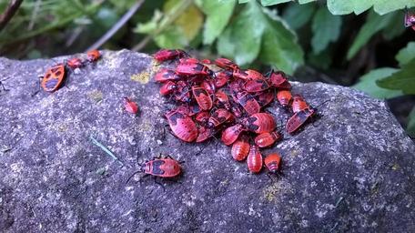 Keywords: Gemeine Feuerwanze.jpg de Gemeine Feuerwanze Pyrrhocoris apterus 2016-07-16 14 35 21 own Scytodes other versions 49 2 33 84 N 9 5 43 71 E alt 236_source exif_heading cc-zero Pyrrhocoris apterus