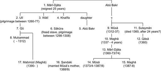 | Keywords: Genealogy kings Mali Empire.svg  en Genealogy of the kings of Mali based on the chronicle of Ibn Khaldun as interpreted by Nehemia Levtzion He first published the genealogy in his paper citation Levtzion N 1963 The thirteenth- and fourteenth-century kings of Mali Journal of African History 4 3 341-353 180027 He republished the genealogy in citation Levtzion Nehemia Ancient Ghana and Mali Methuen London 1973 0841904316 and citation Levtzion Nehemia Hopkins John F P Corpus of Early Arabic Sources for West Africa Marcus Weiner Press New York NY 2000 1-55876-241-8 425 First published in 1981 by Cambridge University Press ISBN 0521224225 2011-06-25 own Aa77zz cc-zero Uploaded with UploadWizard History of West Africa |