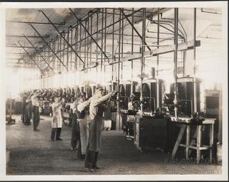 Keywords: kalamazoo public library michigan history photography general gas light company heater fans testing worker assembly line factory manufacturing photo border Interior of General Gas Light Company, unit heater division. Original caption reads, "Test fans on the assembly line." Several unidentified men working on the line. KPL catalogue number P-84. Interior of General Gas Light Company, unit heater division. Original caption reads, "Test fans on the assembly line." Several unidentified men working on the line. KPL catalogue number P-84.