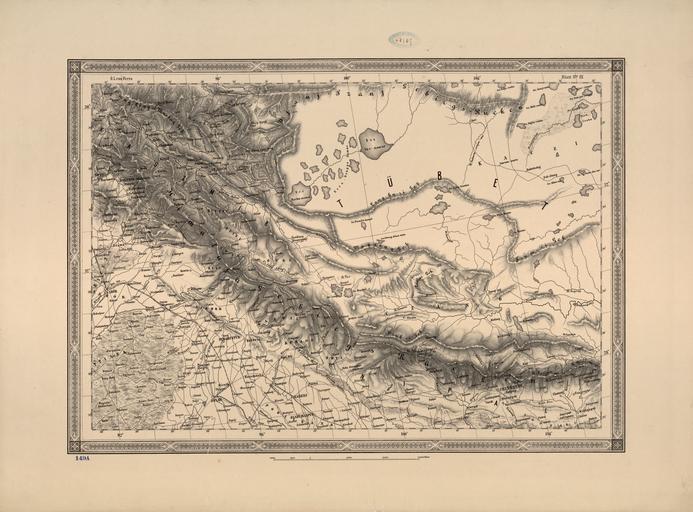 | Keywords: General Map of Central Asia- IX WDL11782.png Artwork ru Авст о-Венге ская мона хия Militärgeographisches Institut fr Monarchie austro-hongroise Militärgeographisches Institut en Austro-Hungarian Monarchy Militärgeographisches Institut zh 奥匈 国 军事 理研究 pt Monarquia austro-húngara Militärgeographisches Institut ar المملكة النمساوية-المجرية المعهد الجغرافي العسكري es Monarquía austrohúngara Militärgeographisches Institut ru Общая ка та Цент альной Азии IX fr Carte générale de l'Asie centrale IX en General Map of Central Asia IX zh 中亚 图: pt Mapa geral da Ásia Central IX ar خريطة عامة لآسيا الوسطى التاسعة ru <em> General-Karte von Central-Asien </em> Общая ка та Цент альной Азии п едставляет собой большую под обную ка ту выпущенную в 1874 г Военным геог афическим институтом в Вене Ка та занимает 12 отдельных листов п онуме ованных от I до XII; на 13-м листе п едоставлена общая инфо мация и уководство с нуме ацией для соединения частей Ка та охватывает обши ный егион на севе о-западе он г аничит с те ито ией России к севе у от Каспийского мо я; на юго-западе с те ито ией сов еменной Саудовской А авии и Омана на севе о-востоке с Западной онголией а на юго-востоке с п овинцией Гуджа ат Индия азвание ключ к символам и пояснения к сок ащениям п иводятся на Листе X в левом нижнем углу юго-запад асштаб указан в семи азличных единицах изме ения английских итальянских усских ту ецких пе сидских китайских и мет ических в нижней части Листа XII В число объектов на ка те входят большие и малые го ода; г аницы госуда ств и п овинций; башни к епости и уины; существующие и п оекти уемые железные до оги; телег афные линии и до оги Из названия следует что ка та была пе есмот ена с учетом лучших и новейших оссийских и английских источников Российская и Б итанская импе ии сопе ничали за установление влияния в Цент альной Азии вели так называемую Большую иг у Они очень хо ошо знали егион благода я данным полученным в ходе научных и военных экспедиций а также в езультате комме ческих контактов fr La <em>General-Karte von Central-Asien</em> Carte générale de l'Asie centrale est une grande carte détaillée réalisée en 1874 par l'Institut géographique militaire de Vienne Elle est composée de 12 planches distinctes numérotées de I à XII et d'une treizième planche contenant une vue générale et un guide numéroté permettant d'assembler la carte La carte couvre une vaste étendue délimitée au nord-ouest par la région de la Russie au nord de la mer Caspienne au sud-ouest par les actuels Arabie saoudite et Sultanat d'Oman au nord-est par la Mongolie occidentale et au sud-est par le Gujarat en Inde La plaque X située dans l'angle inférieur gauche sud-ouest contient le titre la légende des symboles et l'explication des abréviations Au bas de la plaque XII sept échelles sont fournies avec différentes unités de distance anglaise italienne russe turque perse chinoise et métrique La carte indique les villes et les villages les frontières nationales et provinciales les tours les forteresses et les vestiges les chemins de fer existants et en projet les lignes télégraphiques et les routes Selon le titre elle fut « révisée avec les meilleures et les plus récentes sources russes et anglaises » La Russie et l'Empire britannique se disputèrent le contrôle de l'Asie centrale dans une lutte d'influence appelée par la suite « le grand jeu » Ces deux puissances possédaient une expertise particulière de la région qu'elles devaient à leurs expéditions scientifiques et militaires ainsi qu'à leurs relations commerciales en <em>General-Karte von Central-Asien</em> General map of Central Asia is a large detailed map produced in 1874 by the Military Geographic Institute of Vienna The map is on 12 separate plates numbered I XII; a 13th plate gives an overview and a numbered guide to how the parts fit together The map covers a huge expanse bounded to the northwest by the region of Russia north of the Caspian Sea; to the southwest by present-day Saudi Arabia and Oman; to the northeast by western Mongolia; and to the southeast by Gujarat India The title key to symbols and explanation of abbreviations are on Plate X in the lower left-hand southwestern corner Seven scales in different distance units English Italian Russian Turkish Persian Chinese and metric are provided at the bottom of Plate XII The features shown include cities and towns; national and provincial borders; towers fortresses and ruins; existing and projected railroads; telegraph lines; and roads According to the title the map is revised with the best and newest Russian and English sources Russia and the British Empire were rivals for influence in Central Asia in what came to be called the Great Game and they had special expertise about 