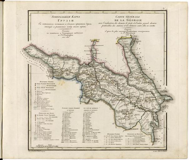 | Keywords: General Map of Georgia. Showing Postal and Major Roads, Stations and the Distance in Versts Between Them- According to the Latest Verified Data in St. Petersburg in 1823 WDL2437.png Artwork ru Пядишев Василий Пет ович fr Piadyshev Vasiliĭ Petrovich en Piadyshev Vasiliĭ Petrovich zh 帕迪谢乌 瓦西利·佩特罗维奇 pt Piadyshev Vasiliĭ Petrovich ar بياديشيف فاسيليي بيتروفيتش es Piadyshev Vasiliĭ Petrovic ru Общая ка та Г узии Изоб ажение почтовой и основных до ог станций и асстояний между ними в ве стах Согласно последним п ове енным сведениям в Санкт- Пете бу ге в 1823 г fr Carte générale de la Géorgie Routes postales et principales gares et distances en verstes entre elles Selon les dernières données analysées à Saint- en General Map of Georgia Showing Postal and Major Roads Stations and the Distance in Versts Between Them According to the Latest Verified Data in St Petersburg in 1823 zh 格鲁吉亚普 图 显示邮政和主要道路,车站和车站之间的俄里 离 根据1823年 彼得堡 新确认数据 pt Mapa Geral da Geórgia Mostrando as rotas postais e os principais eixos rodoviários estações e a distância em versts entre eles Conforme os mais recentes dados verificados em São Petersburgo em 1823 ar خريطة عامة لجورجيا تظهر الطرق البريدية والرئيسية، والمحطات والمسافة في الفرست بينهم بطرسبورغ في 1823 ru Данная ка та 1823 года на кото ой изоб ажена те ито ия Г узии входит в <i> Геог афический атлас Российской импе ии Ца ства Польского и Великого княжества Финляндского </i> в кото ом соб ана 61 ка та Российской импе ии Атлас был составлен и отпечатан полковником В П Пядышевым; он является свидетельством того насколько тщательно и под обно составлялись ка ты усскими военными ка тог афами пе вой четве ти XIX века а ка те показаны к упнейшие го ода семь типов в зависимости от азме ов го ода к епости цитадели и фо ты монасты и и пустыни заводы и фаб ики почтовые дво ы и станции до оги т и типа и г аницы госуда ственные и г аницы п овинций Расстояния указаны в ве стах ве ста являлась усской единицей изме ения длины авной 1 0668 км кото ая к настоящему в емени вышла из упот ебления Условные обозначения и геог афические названия п иведены на усском и ф анцузском языках Изоб аженная те ито ия в общих че тах соответствует те ито ии сов еменной Г узии fr Cette carte de 1823 de la Géorgie est issue de travaux plus importants <i>L'Atlas géographique de l'Empire russe du Royaume de Pologne et du Grand-Duché de Finlande</i> Geograficheskii atlas Rossiiskoi imperii tsarstva Pol'skogo i Velikogo kniazhestva Finliandskogo contenant 61 cartes de l'Empire russe Compilée et gravée par le colonel V P Piadyshev elle reflète la cartographie détaillée effectuée par les cartographes militaires russes au cours du premier quart du 19ème siècle La carte montre les centres de population sept gradations par taille les forteresses les redoutes et les forts les monastères et les déserts les plantes et les usines les relais et stations de poste les routes trois types et les frontières des États et des provinces Les distances sont indiquées en verstes une unité de mesure russe qui n'est plus utilisée égale à 1 0668 kilomètre Les légendes et les noms de lieux sont en russe et en français Le territoire représenté sur la carte correspond approximativement à celui de l'actuelle Géorgie en This 1823 map of Georgia is from a larger work <i>Geographical Atlas of the Russian Empire the Kingdom of Poland and the Grand Duchy of Finland</i> Geograficheskii atlas Rossiiskoi imperii tsarstva Pol'skogo i velikogo kniazhestva Finliandskogo containing 61 maps of the Russian Empire Compiled and engraved by Colonel V P Piadyshev it reflects the detailed mapping carried out by Russian military cartographers in the first quarter of the 19th century The map shows population centers seven gradations by size fortresses redoubts and forts monasteries and deserts plants and factories postal courtyards and stations roads three types and borders state and provincial Distances are shown in versts a Russian measure now no longer used equal to 1 0668 kilometers Legends and place names are in Russian and French The territory depicted on the map roughly corresponds to that of present-day Georgia zh 这幅 1823 年的格鲁吉亚 图出自 部巨 <i> 俄罗斯 国 波兰王国和芬兰大公国 理 图集 </i> (Geograficheskii atlas Rossiiskoi imperii tsarstva Pol'skogo i velikogo kniazhestva Finliandskogo),该 图集共包括 61 幅俄罗斯 国 图 这幅 图集由 V·P·Piadyshev 上校编制和刻版, 反映了 19 世纪前 25 年间俄罗斯军事制图师 达到的碎部测图水平 该 图标注了人口中心(根据大小分成七个等级) 要塞 小型防御工事与堡垒 修道院与沙漠 工厂 邮 和车站 道路(三种)以及 和 区的边界 离采用的单位是俄里,该单位目前已不再使用,1 俄里等于 1 0668 公里 图例和 名采用俄语和法语标注 该 图 描绘