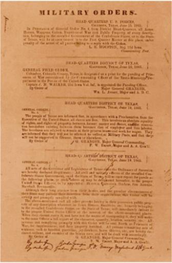 | Keywords: history slavery emancipation holiday juneteenth text document monochrome "The people of Texas are informed that, in accordance with a proclamation from the Executive of the United States, all slaves are free. This involves an absolute equality of personal rights and rights of property, between former masters and slaves and the connection heretofore existing between them, becomes that between employer and hired labor. The Freedmen are advised to remain at their present homes and work for wages. They are informed that they will not be allowed to collect at military posts; and they will not be supported in idleness either there or elsewhere." — Wikipedia (accessed 19 June 2016). ***************** "Juneteenth falls on June 19 each year. It marks what is arguably the most significant event in American history after independence itself—the eradication of American slavery. For centuries, slavery was the dark stain on America’s soul, the deep contradiction to the nation’s founding ideals of “Life, liberty and the pursuit of happiness” and “All men are created equal.” When Abraham Lincoln issued the Emancipation Proclamation on January 1, 1863, he took a huge step toward erasing that stain. [The Emancipation Proclamation declared all slaves to be freed in the Confederate States of America in rebellion and not in Union hands. Lincoln urged the governments in the border states, which had remained in the Union, to free their slaves under a system of gradual abolition but none did so.] The full force of Lincoln's proclamation would not be realized until June 19, 1865—Juneteenth, as it was called by slaves in Texas freed that day. The westernmost of the Confederate states, Texas did not get news of Gen. Robert E. Lee’s surrender at Appomatox that April until two months after the fact. But they heard once Union Gen. Gordon Granger, a New Yorker and West Point graduate with a distinguished wartime service record, arrived in Galveston Bay with more than 2,000 Union troops. It was on June 19 that he publicly read General Order No. 3, which began: “The people of Texas are informed that, in accordance with a proclamation from the Executive of the United States, all slaves are free.” — Smithsonian Magazine (accessed 19 June 2016). "The people of Texas are informed that, in accordance with a proclamation from the Executive of the United States, all slaves are free. This involves an absolute equality of personal rights and rights of property, between former masters and slaves and the connection heretofore existing between them, becomes that between employer and hired labor. The Freedmen are advised to remain at their present homes and work for wages. They are informed that they will not be allowed to collect at military posts; and they will not be supported in idleness either there or elsewhere." — Wikipedia (accessed 19 June 2016). ***************** "Juneteenth falls on June 19 each year. It marks what is arguably the most significant event in American history after independence itself—the eradication of American slavery. For centuries, slavery was the dark stain on America’s soul, the deep contradiction to the nation’s founding ideals of “Life, liberty and the pursuit of happiness” and “All men are created equal.” When Abraham Lincoln issued the Emancipation Proclamation on January 1, 1863, he took a huge step toward erasing that stain. [The Emancipation Proclamation declared all slaves to be freed in the Confederate States of America in rebellion and not in Union hands. Lincoln urged the governments in the border states, which had remained in the Union, to free their slaves under a system of gradual abolition but none did so.] The full force of Lincoln's proclamation would not be realized until June 19, 1865—Juneteenth, as it was called by slaves in Texas freed that day. The westernmost of the Confederate states, Texas did not get news of Gen. Robert E. Lee’s surrender at Appomatox that April until two months after the fact. But they heard once Union Gen. Gordon Granger, a New Yorker and West Point graduate with a distinguished wartime service record, arrived in Galveston Bay with more than 2,000 Union troops. It was on June 19 that he publicly read General Order No. 3, which began: “The people of Texas are informed that, in accordance with a proclamation from the Executive of the United States, all slaves are free.” — Smithsonian Magazine (accessed 19 June 2016). |