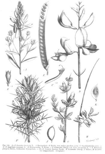 Keywords: Genisteae spp Taub110.png Illustration from book Leguminosae in <br/>Engelmann ed Natürliche Pflanzenfamilien Vol III 3 1891 Paul Hermann Wilhelm Taubert 1862-1897 see http //www biolib de PD-Art Erinacea anthyllis - botanical illustrations Retama raetam - botanical illustrations Genista tinctoria - botanical illustrations Spartium junceum illustrations Ulex europaeus illustrations |