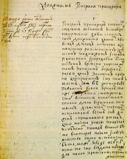 Keywords: Genprok.jpg ru Указ о должности гене ал-п оку о а 27 ап еля 1722 г Указ о должности гене ал-п оку о а Peter I of Russia 1722-04-27 PD-old-100 Police of Russia 1722 in Russia Cyrillic writing