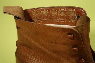 Keywords: Gentlemannen - om män och mode - Hallwylska museet - 85843.tif KÄNGOR snör- ett par<br/><br/>Av brunt kalvskinn <br/><br/>Randsydda och maskinnåtlade <br/>Ovanlädret bestående av besäts tåhätta och skaft; den förstnämda med rakskuren kant tåhättans övre kant perforerad rak <br/>Besäts och skaft hopsydda med en baksöm som på skaften är täckt med en bakrem Snöröppning med fem par runda snörhål med bruna celluloideringar samt fyra par hakar av brun celluloid <br/>Snöröppningen försedd med träns <br/>Snörband av dubbelvävd ljusbrun bomullstrikå med ändbeslag s k dubb av brunerad metall <br/>Plös av brunt kalvskinn <br/>Foder av grågult tvåskaftat linnetyg krage och flyfoder av brunt getskinn <br/>Bak- och tåkappa av styvt läder <br/>Sulorna höger och vänster av tunt läder med rundad smal tå <br/>Bindsulor av tunt koläder Hälbitar av ljust kalvskinn Sulorna avlappade med röd linnetråd sul- och klackkanter putsade med rödkrita <br/>Klack låg rak med insvängd klackfront ytterlappen stiftad med mässingsstift tätare i slitet Kranskanten ornerad påsatt med klack- och bakomtrilla <br/>Hålfoten ornerad med bottentrilla <br/>Sömmarna sydda med brunt silke <br/><br/>Mått <br/>Höjd omkring 16 cm <br/>Sula längd omkring 28 5 cm ; bredd 9 cm <br/>Klack höjd omkring 2 5 cm <br/><br/>Tysk tillverkning Berlin 1907 <br/><br/>Inköpta efter beställning av Walther von Hallwyl den 9 Augusti 1907 från K u K Hof-Schumaschermeister Wilhelm Breitsprecher original caption Gentlemannen - om män och mode<br/> Nyckelord Sko Läder Märke Bruna Föremålsbild Sekelskifte circa size cm 2 5 klack size cm 9 sula circa size cm 16 circa size cm 28 5 sula HWY place of origin original filename hm_dig1894 16019 inventory number HWY XXI I H d 02 85843 CC-BY-SA Samuel Uhrdin <gallery caption Different images of same object > File Gentlemannen - om män och mode - Hallwylska museet - 85828 tif File Gentlemannen - om män och mode - Hallwylska museet - 85841 tif </gallery> Samuel Uhrdin Footwear Leather Clothing in the Hallwyl museum Male clothing Media contributed by LSH dim-with multiple size templates Media contributed by LSH unmatched objKeyword Media contributed by LSH unmatched keyword Close-ups of shoes Yellow-green background Media contributed by LSH 2013-10 |