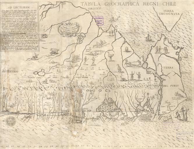 | Keywords: Geographic Chart of the Kingdom of Chile WDL3968.png Artwork ru О ден иезуитов fr Compagnie de Jésus en Society of Jesus zh 稣会 pt Sociedade de Jesus ar جمعية يسوع es Compañía de Jesús ru Геог афическая ка та Ко олевства Чили fr Carte géographique du royaume du Chili en Geographic Chart of the Kingdom of Chile zh 智利王国 图 pt Carta Geográfica do Reino do Chile ar التخطيط الجغرافي لمملكة تشيلي ru Данная ка та составленная чилийским священником-иезуитом Алонсо де Овалле 1601 1651 гг п едставлена в его книге <em>Histórica Relación del Reyno de Chile</em> Повествование об исто ии Ко олевства Чили кото ая считается пе вой книгой посвященной исто ии этой ст аны Ка та стала езультатом большой описательной аботы кото ую Овалле начал во в емя его пе вой поездки в Ев опу в качестве дове енного лица Чили в 1641 году В это в емя иезуиты нуждались в подде жке их миссионе ской аботы на юге Чили и Овалье получил полномочия на п ивлечение помощи и сбо денег Чтобы удовлетво ить пот ебность в инфо мации о Чили в Риме в 1646 г были опубликованы книга и ка та Овалле на испанском и итальянском языках Книга была издана Ф анческо Кавалло; Овалле посвятил свой т уд Папе Римскому Иннокентию Х В книге ассказывается о миссионе ской деятельности иезуитов но основная часть книги посвящена геог афии социальному уст ойству и культу е Чили в течение пе вых 40 лет 17-го века В ней соде жатся под обные описания ландшафта и населения южных егионов ст аны Ка та Овалле является дополнением к тексту кото ый также соде жит иллюст ации вулканов ек и озе изоб ажения животных астений и сцен из повседевной жизни и то говой деятельности населения Изоб ажение местного жителя с хвостом является ст анным элементом кото ому не имеется объяснения С точки з ения ка тог афии в ка те соде жатся ошибки В об ащении к читателю <em>Ad Lectorem</em> Овалле п изнает соде жащиеся в ка те неточности и отсутствие указаний долготы О иенти ы ка ты являются необычными Севе <em>septentrio</em> асположен слева таким об азом Огненная земля находится сп ава агелланов п олив отделяет континент от те а инкогнита тогда еще неизвестного мате ика Анта ктида кото ый изоб ажен в ве хнем п авом углу ка ты к юго-востоку от Южной Аме ики <br>Отк ытия и исследования; агелланов п олив Чили и А гентина ; Огненная земля А гентина s topographiques et ethnologiques détaillées des établissements humains australs La carte d'Ovalle complétait le texte par des illustrations de volcans de fleuves et de lacs accompagnées d'images décoratives de la faune et de la végétation et de scènes représentant diverses activités sociales et commerciales La représentation d'un indigène pourvu d'une queue est un détail curieux inexpliqué Du point de vue cartographique la carte comporte des erreurs Dans sa note au lecteur <em>Ad Lectorem</em> Ovalle admet des incertitudes et l'absence de longitudes L'orientation de la carte est inhabituelle Le Nord <em>septentrio</em> est à gauche ce qui place la Terre de Feu à droite Le détroit de Magellan sépare le continent de la « Terra Incognita » l'Antarctique encore inconnu qui est placé dans le coin supérieur droit au sud-est du continent sud-américain <br>Découverte et exploration; Magellan détroit de Chili et Argentine ; Terre de Feu Argentine s of the southern settlements Ovalle s map complemented the text with illustrations of volcanoes rivers and lakes along with decorative images of wildlife and vegetation and scenes of people engaged in various social and commercial activities The figure of a native with a tail is a puzzling unexplained detail From a cartographic perspective the map contains errors In his statement to the reader <em>Ad Lectorem</em> Ovalle admits uncertainties and the absence of longitudes The orientation of the map is unusual North <em>septentrio</em> is on the left placing Tierra del Fuego on the right The Strait of Magellan divides the mainland from Terra Incognita the as-yet unknown Antarctica which is placed in the upper right-hand corner to the southeast of the South American continent <br>Discovery and exploration; Magellan Strait of Chile and Argentina ; Tierra del Fuego Argentina zh 这张 图见于智利 稣会教士阿隆索·德·奥瓦列(1601-51年)的<em>Histórica Relación del Reyno de Chile</em>(智利王国历史叙述) 书中,此书被视为是这个国家的第 部历史 该 图是奥瓦列 1641年 为智利 行政长官 第 次出访欧洲进行描述 