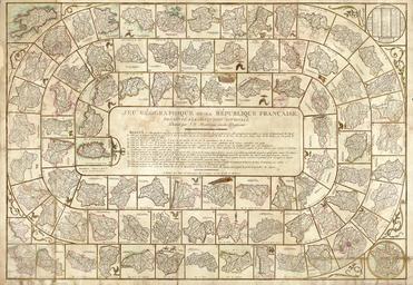 Keywords: Geographical Game of the French Republic WDL118.png Artwork ru обо н Ж fr Mauborgne J N en Mauborgne J N zh 莫博涅 J N pt Mauborgne J N ar موبورن ج ن es Mauborgne J N ru Геог афическая иг а Ф анцузской еспублики fr Jeu géographique de la République française en Geographical Game of the French Republic zh 法兰西共和国 理游戏 pt Jogo geográfico da República Francesa ar اللعبة الجغرافية للجمهورية الفرنسية ru Д обо н бывший п офессо геог афии в Па иже создал эту геог афическую иг у Ф анцузской Республики в честь п авительства ационального соб ания во в емя Ф анцузской еволюции В иг е обо на сове шаются путешествия по еспубликанской Ф анции состоящей из 83 областей - новое те ито иальное деление введеное Революцией вместо более к упных исто ических п овинций Ка та отоб ажает области с их столицами или <i> главными го одами </i>Иг оки движутся по доске п отив часовой ст елки от области к области достигая с едиземномо ского ост ова Ко сика ук ашенного словами свобода и авенство и увенчанного ф игийским колпаком свисающим с копья В левом ве хнем углу ка ты находится ка та-в езка ф анцузской колонии в Ка ибском а хипелаге Сан-Доминго а также многочисленные изоб ажения галльских петухов ставших благода я Революции популя ным национальным символом <br>Админист ативно-те ито иальное деление; астольные иг ы; Геог афический досуг fr J N Mauborgne ancien professeur de géographie à Paris créa ce « jeu géographique de la République française » en l'honneur du gouvernement de la Convention nationale pendant la Révolution française Le but du jeu de Mauborgne était de voyager à travers la France républicaine divisée en 83 « départements » les nouvelles unités d administration territoriale introduites par la révolution pour remplacer les provinces historiques beaucoup plus grandes Chaque case de la carte représente un département différent avec sa capitale ou chef-lieu Les joueurs se déplacent dans le sens inverse des aiguilles d'une montre d'un département à l'autre jusqu à ce qu ils arrivent sur l'île méditerranéenne de Corse ornée des mots « liberté » et « égalité » et couronnée d'un bonnet phrygien se balançant au bout d'une pique Le plateau du jeu présente également dans son coin supérieur gauche une carte en cartouche de la colonie française de Saint-Domingue dans les Caraïbes ainsi que plusieurs coqs gaulois animal que la Révolution avait transformé en un emblème national populaire <br>Divisions administratives et politiques; Jeux de société; Loisirs géographiques en J N Mauborgne a former professor of geography in Paris created this geographical game of the French Republic in honor of the government of the National Convention during the French Revolution Mauborgne s game involves traveling around republican France which was divided into 83 departments the new unit of territorial administration that the Revolution introduced to replace the much larger historical provinces Each space on the map shows a different department with its departmental capital or <i>chef-lieu</i> Players move counter-clockwise about the board from department to department ending on the Mediterranean island of Corsica which is draped in the words liberty and equality and crowned by a Phrygian bonnet dangling on a pike The game board also features in the upper left hand corner an inset map of France s Caribbean colony of Saint-Domingue and numerous Gallic roosters which the Revolution transformed into a popular national image <br>Administrative and political divisions; Board games; Geographical recreations zh J·N· 莫博涅,巴黎的 位前 理学教授, 法国大 命 间为 贺国民议会政 创 了 法兰西共和国 理游戏 莫博涅的游戏内容是周游法兰西共和国,其被分成 83 个 辖区 ,这是 个领 管理的新单位,是法国大 命用 替代历史上比这大得多的 份单位的 图上的每个区域表示不同的辖区及其首 或 <i>城镇 </i>玩游戏 以 时针方向从 个 份到另 个 份移动游戏盘,至 中海科西嘉岛结 ,该岛 之 显示 自由 与 平等 字样,以及 个 长矛上悬挂的弗里吉亚式尖帽 游戏盘左上角还插入了 多明克的法属加勒比殖民 图以及众多高卢公鸡,大 命 间这些图像曾被装饰 国旗上 <br>行政与政治划分; 棋盘游戏; 理休闲娱乐活动 pt J N Mauborgne um ex professor de geografia em Paris criou este jogo geográfico da República Francesa em homenagem ao governo da Convenção Nacional durante a Revolução Francesa O jogo de Mauborgne envolvia viagens através da França republicana que foi dividida em 83 departamentos a nova unidade de administração territorial que a Revolução introduziu para substituir as províncias históricas bem maiores Cada espaço no mapa mostra um departamento diferente com a sua capital departamental ou <i>chef-lieu</i> Os jogadores se deslocavam no sentido anti-horário de departamento para departamento que termina na ilha de Córsega no Mediterrâneo onde se encontram as palavras liberdade e igualdade e um gorro frígio pendente em um pique O jogo apresenta também no seu canto sup