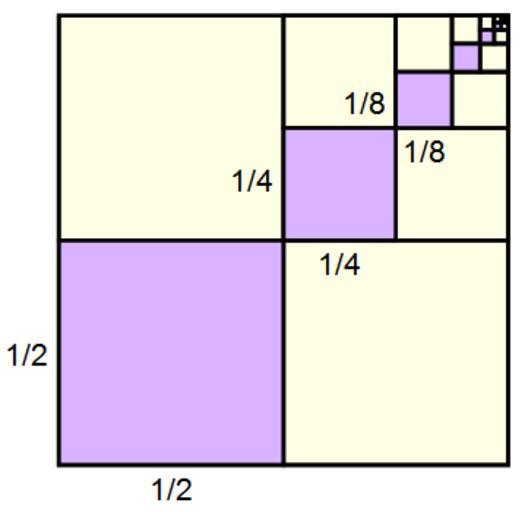 Keywords: GeometricSquares.png An illustration of geometric series Each of the purple squares is 1/4 of the area of the previous square with the total area being <math>\frac 1 4 \ +\ \frac 1 16 \ +\ \frac 1 64 \ +\ \cdots \; \; \frac 1 3 </math> Self from data in Proofs without Words Exercises in Visual Thinking Classroom Resource Material by Roger B Nelson ISBN 978-0883857007 2007-08-08 en User Jim belk Jim belk GeometricSquares svg Original upload log from Wikipedia en 23 28 8 August 2007 359×350 6 KB Jim belk Talk contribs block The geometric series <nowiki><math>\frac 1 4 + \frac 1 16 + \frac 1 64 + \cdots</math></nowiki> sums to 1/3 Geometric series Quadrature of the Parabola Proof without words |