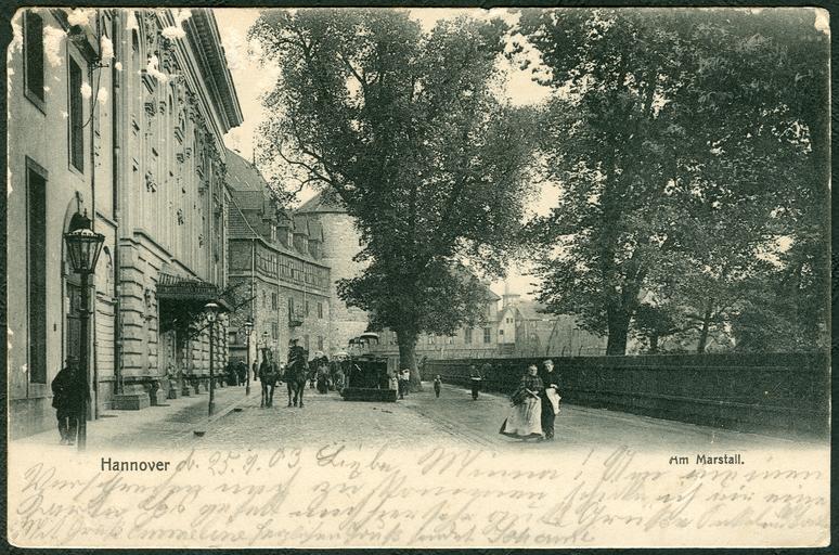 | Keywords: Georg Kugelmann PC 0229 Hannover Am Marstall Bildseite v.l. Festssal, Altes Zeughaus, Beginenturm, Sommerbrücke zur Leineinsel Klein-Venedig., davor Pferde, Kinder, Freuen Am Hohen Ufer.jpg Bildseite der Ansichtskarte Nummer 229 aus dem Verlag von Georg Kugelmann Zu sehen ist eine belebte Situation um 1900 Am Marstall heute Am Hohen Ufer Ganz links das noch heute erhaltene und denkmalgeschützte Marstallgebäude mit den bekrönten Insignien von König Georg V von Hannover dahinter das während der Luftangriffe auf Hannover im Zweiten Weltkrieg zerstörte Gebäude das hier noch als Festsaal wirbt an dessen Stelle später die Hauptschule an der Burgstraße erbaut wurde die heute Stand 02/2014 zur neuen Ada-und-Theodor-Lessing-Volkshochschule umgebaut wird Dahinter ist das alte Zeughaus vor dem Beginenturm heute Historisches Museum Hannover zu sehen von wo aus nach rechts die Sommerbrücke auf die Leineinsel Klein-Venedig führt Im Vordergrund sind Männer auf Pferden zu sehen sowie Frauen und spielende Kinder Scan vom Original Bernd Schwabe in Hannover ~ 1900 Georg Kugelmann and others <gallery> File Georg Kugelmann PC 0229 Hannover Am Marstall Adressseite 1903 an Fräulein Minna Wehrbein in Aerzen bei Hameln jpg Adressseite der 1903 an Fräulein Minna Wehrbein Aerzen versandten Ansichtskarte Nr 229 </gallery> PD-old Georg Kugelmann Alter Marstall Hannover Leineinsel Klein-Venedig Hannover Children in Hannover Horses in Hannover Beginenturm Hannover |