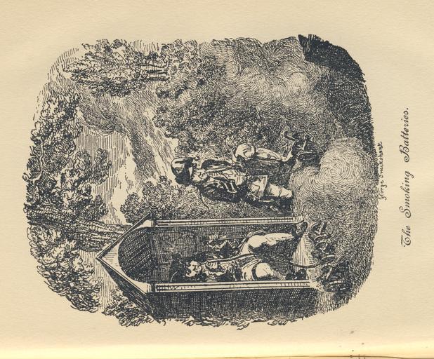 | Keywords: George Cruikshank - Tristram Shandy, Plate VIII. The Smoking Batteries original scan.png Original unmodified and unrotated scan From George Cruikshank's illustrations to Laurence Sterne's Tristram Shandy Plate VIII The Smoking Batteries Uncle Toby in the sentry box the corporal on the right Basically the corporal has invented a way to make multiple cannons be fired at once by using the principles of a hookah - when a puff is taken the cannons fire Unfortunately the two find the puffing a little too enjoyable The Life and Opinions of Tristram Shandy Gentleman and A Sentimental Journey Through France and Italy by Laurence Sterne With Illustrations by George Cruikshank London Hutchinson Co Paternoster Row 1906 This version published 1906 George Cruikshank 1792 “1878 PD-Old-100 Part of a series of illustrations of Tristram Shandy <gallery widths 200px heights 250px> File George Cruikshank - Tristram Shandy Plate I The Effects of Trim's Eloquence jpg Plate I The Effects of Trim's Eloquence<br/> PNG Scan File George Cruikshank - Tristram Shandy Plate II Obadiah leading in Dr Slop jpg Plate II Obadiah leading in Dr Slop<br/> PNG Scan File George Cruikshank - Tristram Shandy Plate III The Jack-boots transformed into Mortars jpg Plate III The Jack-boots transformed into Mortars<br/> PNG Scan File George Cruikshank - Tristram Shandy Plate IV The long-nosed Stranger of Strasburg jpg Plate IV The long-nosed Stranger of Strasburg<br/> PNG Scan File George Cruikshank - Tristram Shandy Plate V My Uncle Toby on his Hobby-horse jpg Plate V My Uncle Toby on his Hobby-horse<br /> PNG Scan File George Cruikshank - Tristram Shandy Plate VI Trim's relation of Tristram's misfortune jpg Plate VI Trim's relation of Tristram's misfortune<br/> PNG Scan File George Cruikshank - Tristram Shandy Plate VII The Quarrel of Slop and Susannah jpg Plate VII The Quarrel of Slop and Susannah<br/> PNG Scan File George Cruikshank - Tristram Shandy Plate VIII The Smoking Batteries jpg Plate VIII The Smoking Batteries<br/> PNG Scan </gallery> Original Uncategorized 2014 December 25 |