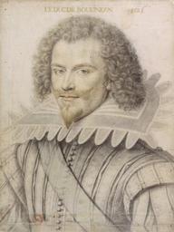 | Keywords: George Villiers Duke of Buckingham by Dumonstier.png George Villiers 1st Duke of Buckingham Le duc de Buckingham 1625 H 0 462 ; L 0 350 Au-dessus du portrait identification et date Béthune avec le nom de Boukinkan déformation de Buckingham très fréquente en France à cette époque avec l ™orthographe Bouquinquant En hautà dr deux lignes grattées et presque illisibles mais où l ™on peut encore lire de la main de Daniel Dumonsier fait le ¦ / ¦ par D ¦ ; au-dessous au crayon noir ancien n° 132 de la BSG BNF Est Na 24 res f°13 http //visualiseur bnf fr/ConsulterElementNum Destination Daguerre O 7914934 E JPEG 1625 Creator Daniel Dumonstier PD-old-100 Daniel Dumonstier George Villiers 1st Duke of Buckingham 1620s portraits Cabinet des Estampes BNF |