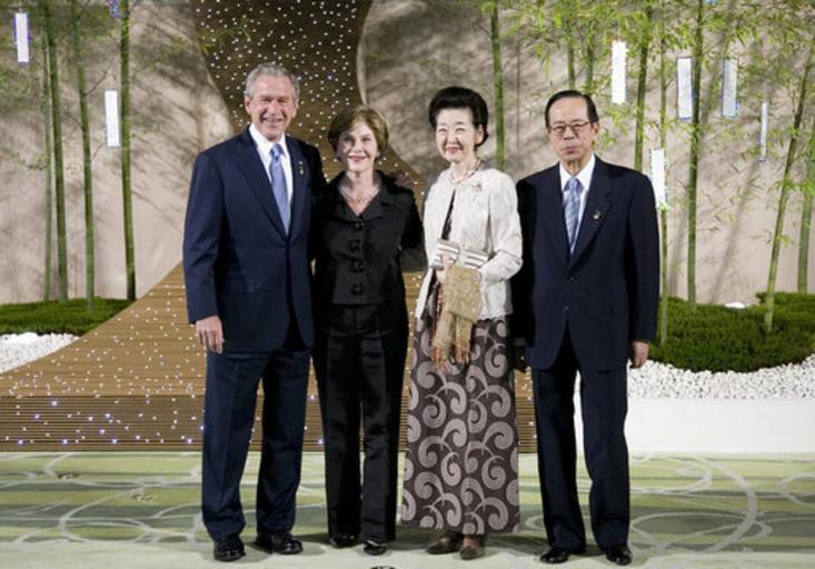 | Keywords: George W Bush Laura Bush Kiyoko Fukuda and Yasuo Fukuda 20080707.jpg en President George W Bush and Mrs Laura Bush stand with Prime Minister Yasuo Fukuda and Mrs Kiyoko Fukuda at the Windsor Hotel Toya Resort and Spa in Tōyako Town Abuta District Hokkaidō on July 7 2008 http //www whitehouse gov/news/releases/2008/07/images/20080707_d-0366-515h html President George W Bush and Mrs Laura Bush stand with Japan's Prime Minister Yasuo Fukuda and Mrs Kiyoko Fukuda in the Banquet Lobby of the Windsor Hotel Toya Resort and Spa Monday July 7 2008 in Toyako Japan prior to the Dinner with G-8 Leaders and Spouses White House photo by Eric Draper White House photo by Eric Draper 2008-07-07 PD-USGov 34th G8 summit George W Bush in 2008 Laura Bush Yasuo Fukuda in 2008 Kiyoko Fukuda George W Bush and Yasuo Fukuda Photographs by Eric Draper |