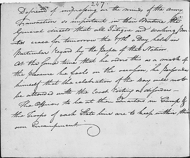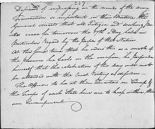 | Keywords: u.s. national archives usnationalarchives today's document todaysdocument march march 16 march16 march 16, 1780 march161780 03/16/1780 03161780 nara:arcid=300356 geoge washington geogewashington st. patrick's day stpatricksday holiday order text blackandwhite writing monochrome document texture abstract black and white Title: George Washington's General Order of March 16, 1780, granting Saint Patrick's Day as a holiday to the troops., 03/16/1780 - 03/16/1780 Production Date: March 16, 1780 George Washington's General Order of March 16, 1780, granting Saint Patrick's Day as a holiday to the troops., 03/16/1780 (ARC ID 300356); Numbered Record Books, 1894 - 1913; War Department Collection of Revolutionary War Records, 1709 - 1915; Record Group 93, National Archives. Persistent URL: arcweb.archives.gov/arc/action/ExternalIdSearch?id=300356 Access Restrictions: Unrestricted Use Restrictions: Unrestricted Title: George Washington's General Order of March 16, 1780, granting Saint Patrick's Day as a holiday to the troops., 03/16/1780 - 03/16/1780 Production Date: March 16, 1780 George Washington's General Order of March 16, 1780, granting Saint Patrick's Day as a holiday to the troops., 03/16/1780 (ARC ID 300356); Numbered Record Books, 1894 - 1913; War Department Collection of Revolutionary War Records, 1709 - 1915; Record Group 93, National Archives. Persistent URL: arcweb.archives.gov/arc/action/ExternalIdSearch?id=300356 Access Restrictions: Unrestricted Use Restrictions: Unrestricted |