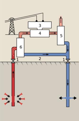Keywords: Geothermal Hot Water System.svg en Diagram showing how electricity is generated from a hot-water hydrothermal system The part of the hydrothermal water that flashes to steam is separated and used to drive a turbine generator Wastewater from separator and condenser is injected back into the subsurface to help extend the useful life of the hydrothermal system <br /> Key 1 Wellheads 2 Ground surface 3 Generator 4 Turbine 5 Condenser 6 Separator 2004 http //pubs usgs gov/circ/2004/c1249/ USGS Circular 1249 2004 p11 Wendell A Duffield John H Sass PD-USGov Uploaded with UploadWizard United States Geological Survey Geothermal power plant schemas