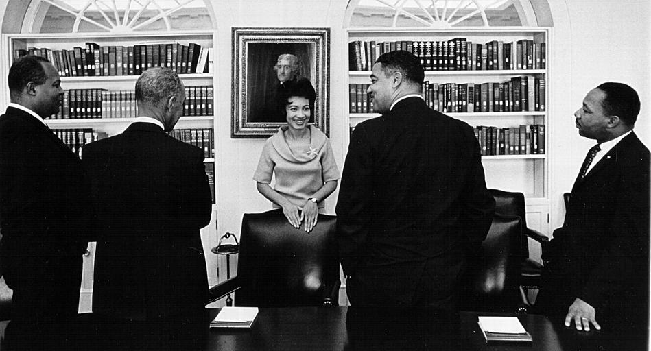 | Keywords: GeraldineWhittington.jpg Geraldine Gerri Whittington encounters four civil rights leaders James Farmer Roy Wilkins Whitney M Young and Martin Luther King Jr Whittington the first black secretary to the US President was appointed by Lyndon Johnson in 1963 This photograph was probably taken on January 18 1964 as the four were en route to meet with President Johnson 1964-09-18 http //997now cbslocal com/photo-galleries/2011/01/17/remembering-martin-luther-king-jr/civil-rights-movement-4/ United States Information Agency USIA /Okamoto U S National Archives as 306-PSA-64-268 PD-USGov Uploaded with UploadWizard Martin Luther King Jr in 1964 0918 Roy Wilkins James L Farmer Jr Whitney Young White House in 1964 |