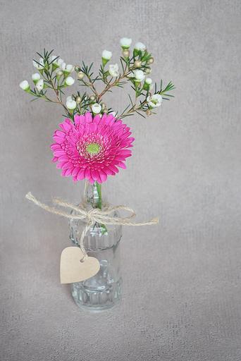 Keywords: gerbera frangipani white pink blossom bloom vase glass heart pendant deco decoration spring flower schnittblume close still life