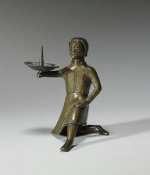 Keywords: German - Candlestick with a Young Page - Walters 5484 - Three Quarter.jpg Candles were expensive and used by affluent households This candle holder demonstrates the desire to make home furnishings ornamental imaginative and indicative of status It is cast in the shape of a young page who kneels to hold the candle for his lord -- understood to be the person to whom this candle stick belonged century 14 15 Medieval bronze cm 14 6 10 8 11 7 accession number 54 84 20860 Lehmann secretary to Baron Alphonse de Rothschild Paris Henri Daguerre Paris date and mode of acquisition unknown Henry Walters city Baltimore Walters Art Museum Henry Walters Acquired by Henry Walters 1927 Highlights from the Collection The Walters Art Gallery Baltimore 1998-2001 place of origin Germany Walters Art Museum license Medieval metalwork in the Walters Art Museum German art in the Walters Art Museum Media contributed by the Walters Art Museum needs category review