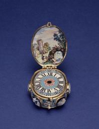 | Keywords: German - Enameled Watch with Cameos - Walters 58120 - Open.jpg Although the earliest enamel watches came from Blois France the German city of Augsburg had long been a center of clock and watch making This is one of the earliest examples of a painted-enamel watch made in Germany It is set with eight cameos and thirteen rubies The agate cameos are contemporary not antique gems but they still advertise the patron's sophisticated taste for the antique style The inside covers depict landscapes with ancient ruins and pastoral scenes reflecting another aspect of the classicizing taste of the time between 1640 1650 gilded brass paint on enamel rubies and agate case gold and paint on enamel dial brass movement cm 5 3 5 accession number 58 120 18059 Henry Walters Baltimore date and mode of acquisition unknown Walters Art Museum Henry Walters Acquired by Henry Walters Signature Johann Ferdinand Mehrer World of Wonder The Walters Art Gallery Baltimore 1971-1972 place of origin Augsburg Germany Walters Art Museum license Baroque art in the Walters Art Museum German art in the Walters Art Museum Fob watches 17th-century watches Media contributed by the Walters Art Museum needs artist review Painted enamel art in the Walters Art Museum |