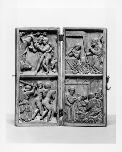 | Keywords: German - The Temptation, Expulsion, Annunciation, and Adoration of the Magi - Walters 6111.jpg This tiny folding diptych is in the form of a prayerbook which opens to reveal four biblical scenes to be read as meditations On the left two Old Testament episodes- the Temptation of Adam and Eve and the Expulsion from the Garden of Eden- are set across from two New Testament stories- the Annunciation and the Adoration of the Magi The sin of Adam and mankind's fall from grace is redeemed by the granting of God's grace in the incarnation of the Word at the Annunciation and the universal recognition of Christ's divinity between 1520 1540 Renaissance boxwood cm 9 7 8 3 accession number 61 11 4305 Joseph Brummer New York date and mode of acquisition unknown Henry Walters Baltimore 1929 mode of acquisition unknown Walters Art Museum Henry Walters Acquired by Henry Walters 1929 place of origin south Germany Walters Art Museum license Renaissance reliefs in the Walters Art Museum German art in the Walters Art Museum The Fall Media contributed by the Walters Art Museum needs category review |
