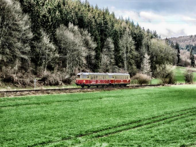 Keywords: germany landscape scenic train tram railroad transportation forest trees woods sky clouds nature outside country countryside rural hdr