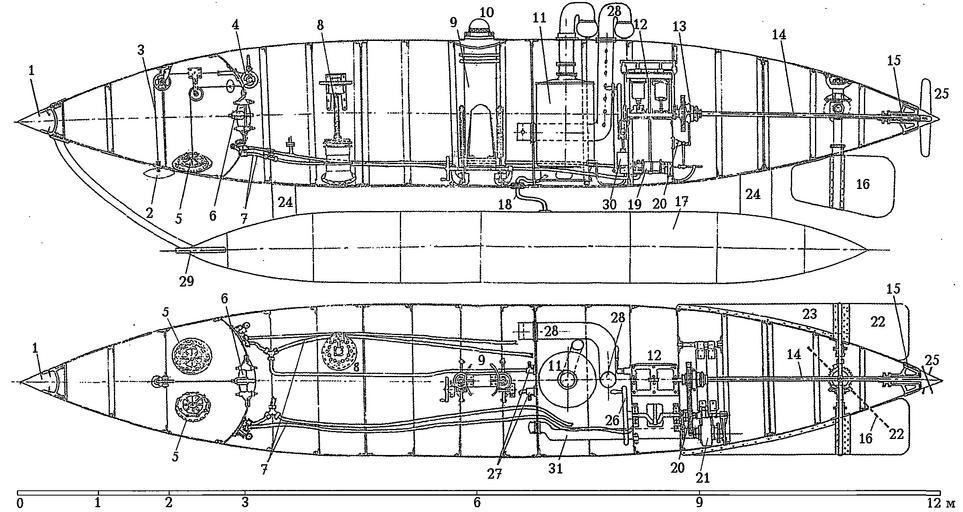 Keywords: Gern submarine 4.jpg ru Схематические че тежи лодки Ге на 4 РГАВ Ф 876 1 - езиновый амо тизато ; 2 - яко ь с п иводом 3 и лебедкой 4 ; 5 - водолазные люки; 6 - две ь в водолазное отделение; 7 - т убоп оводы воздушные и водяные показаны частично ; 8- егулято плавучести объема ко пуса ; 9 - выдвижная убка егулято плавучести ; 10 - входной люк колпак с иллюминато ами; 11 - па овой котел с дымовой т убой и об атным клапаном; 12 - па овая воздушная машина; 13 - муфта г ебного вала; 14 - г ебной вал; 15 - дейдвуд; 16 - ве тикальный уль; 17 - воздушный баллон на подвесе 24 ; 18 - воздухоп овод; 19 - т юмная помпа комп ессо с п иводом от па овой машины 20 и учным 26 ; 21 - вентилято ; 22 - го изонтальные ули; 23 - стабилизато ы; 25 - г ебной винт; 27 - учной насос; 28 - воздухозабо ное уст ойство; 29 - площадка-опо а для аботающих в воде; 30 - питательный насос; 31 - нагнетательная т уба вентилято а 2013-08-14 20 18 30 РГАВ Ф Ф 876 азмещен в сбо нике Гангут 2008/47 ст 61 author PD-Art Uploaded with UploadWizard Submarines |