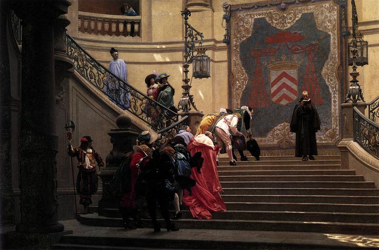 | Keywords: Gérôme Eminence grise 1873.jpg  Grey Eminence François Leclerc du Tremblay 1577 “1638 the right-hand man of Cardinal Richelieu Scan Richelieu Art and Power 2002 exhibition catalog edited by Hilliard Todd Goldfarb p 381 Montreal Montreal Museum of Fine Arts ; Cologne Wallraf-Richartz-Museum “ Fondation Corboud ; Ghent Belgium Snoeck-Ducaju Zoon ISBN 9789053494073 1873 Oil on canvas cm 68 6 101 Museum of Fine Arts Boston Lorna and Robert Rosenberg Gallery credit line Bequest of Susan Cornelia Warren accession number 03 605 The scene is anachronistic Tremblay died in 1638 but the Palais-Royal staircase depicted in a somewhat modified form was not constructed until c 1765 to the designs of Pierre Contant d'Ivry http //www mfa org/collections/object/leminence-grise-31214 Museum of Fine Arts Boston PD-old-100 François Leclerc du Tremblay 1873 paintings Portrait paintings of men of France Oil paintings from France Bowing France in history paintings History paintings by Jean-Léon Gérôme Paintings of coats of arms People on stairs 1870s paintings from France |