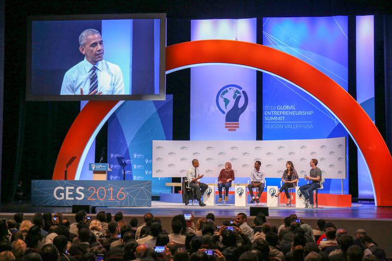 | Keywords: President Obama, Facebook CEO Mark Zuckerberg, and three entrepreneurs - Mai Medhat, Jean Bosco Nzeyimana, and Mariana Costa Checa - sit on a panel at the Global Entrepreneurship Summit, June 24, 2016 at Stanford University in Palo Alto, California. [GES Photo/Public Domain] siliconvalley obama potus stanforduniversity presidentobama ges2016 |