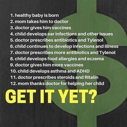 | Keywords: anti vaccine vaccination vax disease health poison population control needle syringe 1. Healthy baby is born. 2. Mom takes him to doctor. 3. Doctor gives him vaccines. 4. Child develops ear infections and other issues. 5. Doctor prescribes antibiotics and Tylenol. 6. Child continues to develop infections and illness. 7. Doctor prescribes more antibiotics and Tylenol. 8. Child develops food allergies and eczema. 9. Doctor gives him more vaccines. 10. Child develops asthma and ADHD. 11. Doctor prescribes steroids and Ritalin. 12. Mom thanks doctor for helping her child. Anti Vaccination meme collected by A.J. Wilson of iPressThis at FlatEarth.Online, made by others. 1. Healthy baby is born. 2. Mom takes him to doctor. 3. Doctor gives him vaccines. 4. Child develops ear infections and other issues. 5. Doctor prescribes antibiotics and Tylenol. 6. Child continues to develop infections and illness. 7. Doctor prescribes more antibiotics and Tylenol. 8. Child develops food allergies and eczema. 9. Doctor gives him more vaccines. 10. Child develops asthma and ADHD. 11. Doctor prescribes steroids and Ritalin. 12. Mom thanks doctor for helping her child. Anti Vaccination meme collected by A.J. Wilson of iPressThis at FlatEarth.Online, made by others. |