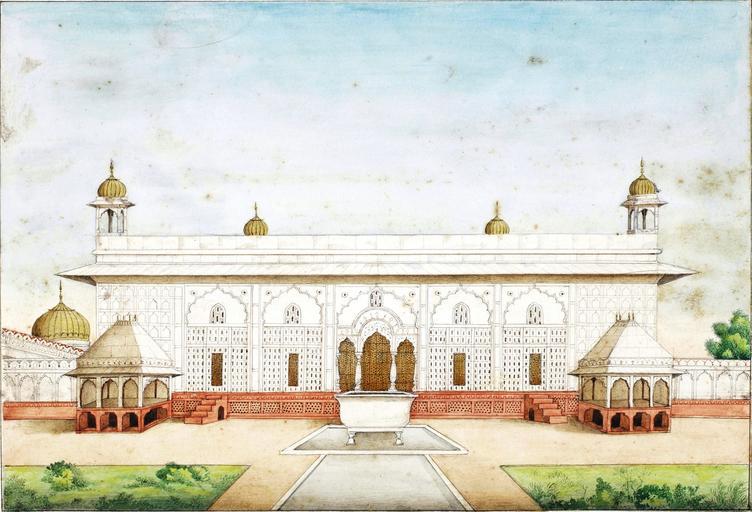 | Keywords: Ghulam Ali Khan 010b.jpg  The Rung Muhul The Rang Mahal inside the Red Fort A series of 31 paintings by Ghulam Ali Khan fl 1817-55 consisting of views of monuments in and around Delhi and including four portraits of the last Mughal Emperor Bahadur Shah II reg 1837-58 and his sons Watercolour and gold on paper black margin rules three title pages three sheets of portraits all with identifying inscriptions in English and in Persian in nasta'liq script in black ink the portraits with further inscriptions in nasta'liq script with the date November 1852 Christian date written in Arabic in later mounts loose in contemporary green leather-covered despatch box the lid embossed in gold DELHEE 1854 Size paintings 290 x 215 mm and slightly smaller; mounts 318 x 394 mm ; box 435 x 365 x 110 mm File Ghulam Ali Khan 010 jpg circa 1852 1854 Ghulam Ali Khan PD-Art-100 Rang Mahal Red Fort Red Fort in art |