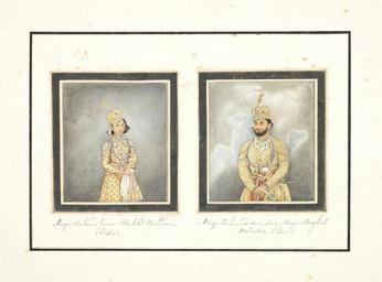 Keywords: Ghulam Ali Khan 016.jpg Two portraits Mirza Mahomed Juwan Bakht Bahadoor 3d son; Mirza Zuheer ood deen alias Mirza Mooghul Bahadur 2nd Son Mirza Muhammad Zahir al-Islam known as Mirza Mughul Bahador on the right and Mirza Muhammad Javan Bakht Bahadur on the left both signed by Ghulam 'Ali Khan A series of 31 paintings by Ghulam Ali Khan fl 1817-55 consisting of views of monuments in and around Delhi and including four portraits of the last Mughal Emperor Bahadur Shah II reg 1837-58 and his sons Watercolour and gold on paper black margin rules three title pages three sheets of portraits all with identifying inscriptions in English and in Persian in nasta'liq script in black ink the portraits with further inscriptions in nasta'liq script with the date November 1852 Christian date written in Arabic in later mounts loose in contemporary green leather-covered despatch box the lid embossed in gold DELHEE 1854 Size paintings 290 x 215 mm and slightly smaller; mounts 318 x 394 mm ; box 435 x 365 x 110 mm http //www bonhams com/auctions/20833/lot/352/ 1852-11 Ghulam Ali Khan 100px 100px PD-Art-100 Sketches of The Delhee Palace Delhee 1854