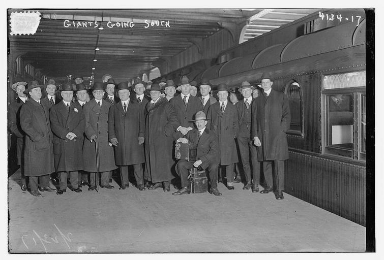 | Keywords: Giants going South (LOC) (16271342197).jpg Bain News Service publisher Giants going South 1917 date created or published later by Bain 1 negative glass ; 5 x 7 in or smaller Notes Title from data provided by the Bain News Service on the negative Forms part of George Grantham Bain Collection Library of Congress Subjects Baseball Format Glass negatives Rights Info No known restrictions on publication Repository Library of Congress Prints and Photographs Division Washington D C 20540 USA http //hdl loc gov/loc pnp/pp print hdl loc gov/loc pnp/pp print General information about the Bain Collection is available at http //hdl loc gov/loc pnp/pp ggbain hdl loc gov/loc pnp/pp ggbain Higher resolution image is available Persistent URL http //hdl loc gov/loc pnp/ggbain 23778 hdl loc gov/loc pnp/ggbain 23778 Call Number LC-B2- 4134-17 https //www flickr com/photos/library_of_congress/16271342197/ Giants going South LOC LOC-image ggbain 23778 https //www flickr com/people/8623220 N02 The Library of Congress http //www loc gov/rr/print/195_copr html noknown The Library of Congress Flickr Commons PD-Bain The Library of Congress http //flickr com/photos/8623220 N02/16271342197 2015-02-15 02 52 41 pd |