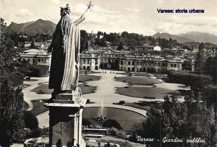 Keywords: Il parterre con il Palazzo Estense (arch. Giuseppe Antonio Bianchi, 1766-73) e la fontana centrale, visti dalla statua dell'Italia liberata (con spada spezzata) posta sopra la fontana del "grottesco" (1767-69). varese giardinipubblici palazzoestense