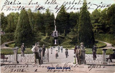 | Keywords: Immagine di inizio XX secolo. Dietro la fontana centrale la statua di Umberto I. La fontana superiore, il "grottesco" (1767-69) è sormontata dalla statua dell'Italia liberata. All'estrema sinistra è visibile un angolo della costruzione che ospitava il deposito delle carrozze ducali (non più esistente). varese giardinipubblici |