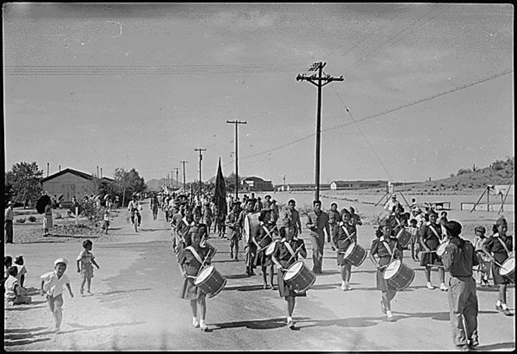Keywords: u.s. national archives usnationalarchives fourth of july fourthofjuly independence day independenceday nara:arcid=539573 japanese-american internment japaneseamericaninternment internment marching band marchingband japanese relocation holiday parade arizona war gila river relocation center gilariverrelocationcenter rivers, arizona riversarizona rivers girl scouts drum and bugle corps girlscoutsdrumandbuglecorps 4th of july parade 4thofjulyparade national holiday nationalholiday segregation war relocation authority warrelocationauthority world war ii worldwarii japanese-americans japaneseamericans children bands marching girl scouts girlscouts blackandwhite monochrome outdoor black and white Original Caption: Gila River Relocation Center, Rivers, Arizona. Girl Scouts Drum and Bugle Corp. participate in the 4th of July parade. U.S. National Archives’ Local Identifier: 210-G-G717 From:: Central Photographic File of the War Relocation Authority, compiled 1942 - 1945 Created By:: Department of the Interior. War Relocation Authority. (02/16/1944 - 06/30/1946) Production Date: 07/04/1944 Persistent URL: arcweb.archives.gov/arc/action/ExternalIdSearch?id=539573 Repository: Still Picture Records Section, National Archives at College Park (College Park, MD) For information about ordering reproductions of photographs held by the Still Picture Unit, visit: www.archives.gov/research/order/still-pictures.html Reproductions may be ordered via an independent vendor. NARA maintains a list of vendors at www.archives.gov/research/order/vendors-photos-maps-dc.html Access Restrictions: Unrestricted Use Restrictions: Unrestricted Original Caption: Gila River Relocation Center, Rivers, Arizona. Girl Scouts Drum and Bugle Corp. participate in the 4th of July parade. U.S. National Archives’ Local Identifier: 210-G-G717 From:: Central Photographic File of the War Relocation Authority, compiled 1942 - 1945 Created By:: Department of the Interior. War Relocation Authority. (02/16/1944 - 06/30/1946) Production Date: 07/04/1944 Persistent URL: arcweb.archives.gov/arc/action/ExternalIdSearch?id=539573 Repository: Still Picture Records Section, National Archives at College Park (College Park, MD) For information about ordering reproductions of photographs held by the Still Picture Unit, visit: www.archives.gov/research/order/still-pictures.html Reproductions may be ordered via an independent vendor. NARA maintains a list of vendors at www.archives.gov/research/order/vendors-photos-maps-dc.html Access Restrictions: Unrestricted Use Restrictions: Unrestricted |