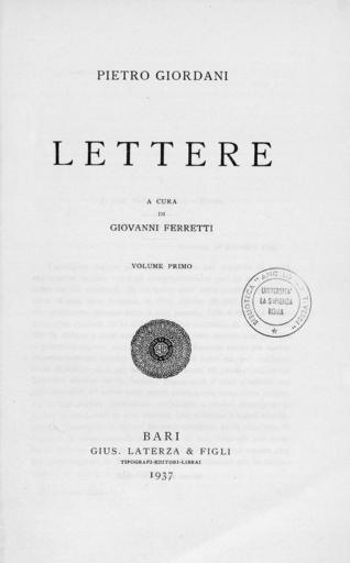 | Keywords: Giordani - Opere. Lettere e carteggi, 1937 - 1834454 0005.jpg Book Giordani Pietro Opere Lettere e carteggi G Laterza Bari ita it 1 Lettere / Pietro Giordani ; a cura di Giovanni Ferretti 1 - Bari G Laterza 1937 - 318 p ; 22 cm - Scrittori d'Italia ; 163 Frontespizio BEIC 1834454 Institution BEIC PD-old-100-1923 1937 books Pietro Giordani |