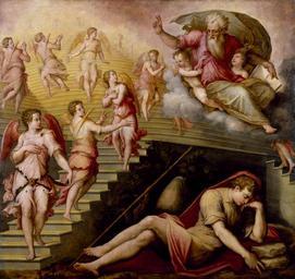 | Keywords: Giorgio Vasari II - Jacob's Dream - Walters 372508.jpg As recounted in the Old Testament book of Genesis on his way to Haran Jacob lay down in the wilderness to sleep resting his head on a stone He dreamed of angels ascending and descending a stairway or ladder to heaven here depicted as a monumental Renaissance-style staircase God then appeared and blessed Jacob and his descendants This large panel apparently intended for a ceiling was done by the painter architect and author Giorgio Vasari for the Florentine Marsilio degli Albizi in 1558 The figures of God the Father and Jacob are based on famous frescoes by Michelangelo 1475-1564 and Raphael 1483-1520 in the Vatican Vasari wrote the first history of Italian art in which he praised these Roman frescoes as the culmination of the art of painting His references to them in his painting are another form of homage Zeri Italian paintings in the Walters Art Gallery 215 331-333 between 1557 1558 Renaissance oil on panel Painted surface cm 224 6 237 3 5 accession number 37 2508 17863 Guglielmo del Tovaglia or Marsilio degli Albizi Florence 1558 Justice James A Murnaghan Dublin 1930 mode of acquisition unknown Walters Art Museum Gift of the Dr Francis D Murnaghan Fund 1973 Highlights from the Collection The Walters Art Gallery Baltimore 1998-2001 place of origin Florence Italy Walters Art Museum license Italian Renaissance paintings in the Walters Art Museum Paintings by Giorgio Vasari Jacob's ladder Media contributed by the Walters Art Museum needs category review |