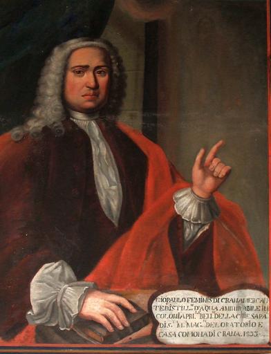 | Keywords: Giovanni Paolo Feminis.jpg Ritratto attribuito a Giovanni Paolo Feminis ca 1660-1736 custodito nella sacrestia della chiaesa di San Rocco a Crana Val Vigezzo L'attribuzuioone è incerta Secondo alcuni il ritratto sarebbe di Monsieur Dinocheau membro della famiglia promotrice della fondazione per la chiesa di Saint Roch nella Rue Saint Honoré a Parigi http //www eau-de-cologne com/it/Femminis-Dipinti html Dr Karl Kempkes Analisi del valore documentario dei cosiddetti Ritratti di Feminis Ritratto di Giovanni Paolo Feminis ca 1660-1736 custodito nella sagrestia della chiesa di Crana Fotografia di Gianmarco Ceccomori con licenza d'uso Transferred from http //it wikipedia org it wikipedia date date on painting is 1833 but see link Unknown Original uploader was Claudiolui at http //it wikipedia org it wikipedia PD-old-100 Original upload log page it wikipedia Giovanni_Paolo_Feminis jpg 2009-06-09 16 45 Claudiolui 1944×2538× 3354542 bytes <nowiki>Ritratto di Giovanni Paolo Feminis ca 1660-1736 custodito nella sagrestia della chiesa di Crana Fotografia di Gianmarco Ceccomori con licenza d'uso</nowiki> Giovanni Paolo Feminis Art in Onsernone Art of the canton of Ticino Paintings in Switzerland |