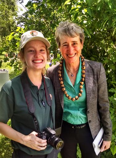 Keywords: national park service nationalparkservice interns youth programs youthprograms gip geoscientists-in-the-parks geoscientistsintheparks groupshot people outdoor GIP intern Sarah Sparhawk (Biological Resources Division) with U.S. Secretary of the Interior Sally Jewell. NPS photo GIP intern Sarah Sparhawk (Biological Resources Division) with U.S. Secretary of the Interior Sally Jewell. NPS photo |